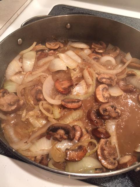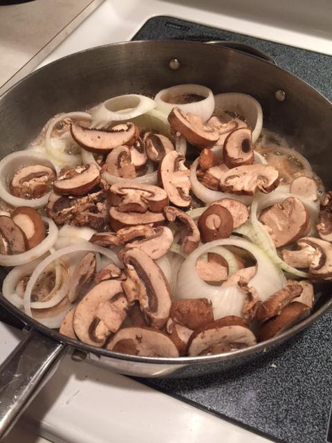 - Add the remaining butter to the same skillet. Sauté the mushrooms and onions until softened and lightly browned.