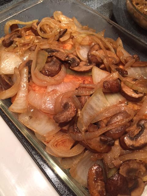 - Spoon the mushroom and onion mixture evenly over the chicken. Cover loosely with foil and bake for 20 minutes.