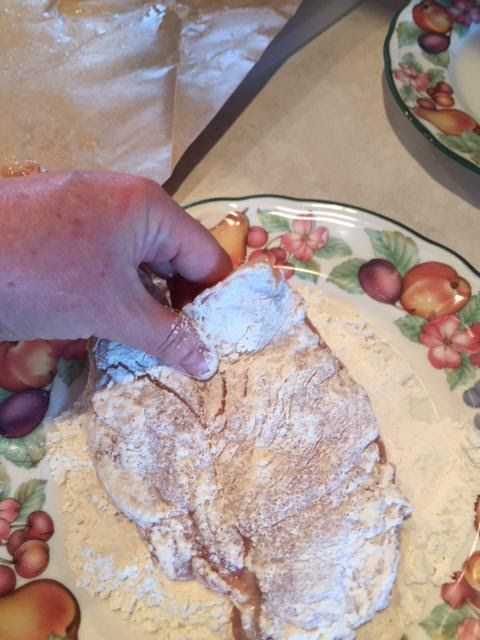 - Place the chicken breasts between sheets of wax paper or plastic wrap and pound to about ⅛-inch thickness. Dredge each piece lightly in flour, shaking off excess.