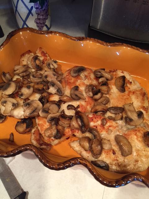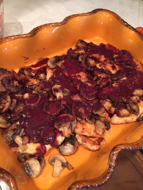 - Pour the sauce evenly over the chicken and mushrooms.