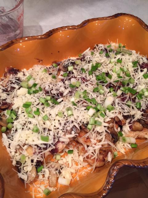 - Combine the Fontina (or mozzarella), Parmesan, and green onions. Sprinkle evenly over the top.