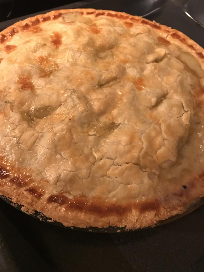 - Bake for 40 to 45 minutes, until the crust is golden brown. Let cool for 10 minutes before slicing and serving.