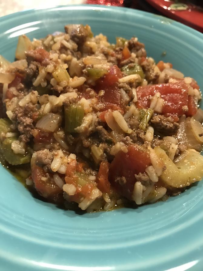 kcalA hearty one-skillet Spanish rice made with ground beef, vegetables, tomatoes, and warm spices.