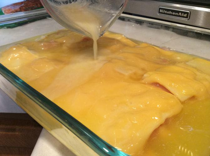 - Spread the cream of chicken soup evenly over the cheese and chicken.