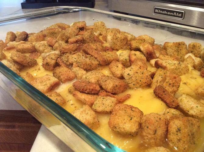 - Sprinkle the seasoned croutons evenly over the entire dish.