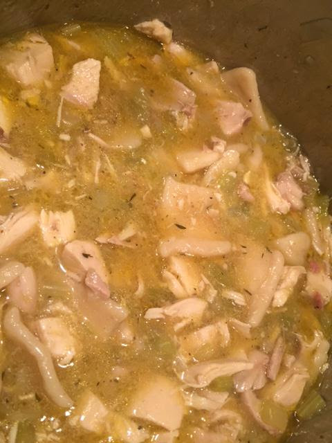 - Remove the chicken from the pot and let it cool slightly. Pull the meat from the bones, chop into bite-size pieces, and return the chicken to the pot. Keep warm over low heat.