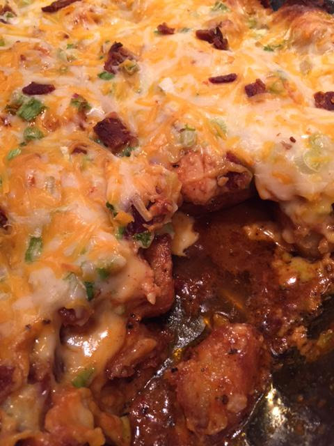 Dietary Notes & Health Alerts: This recipe is high in saturated fat (over 20% of the FDA daily value per serving), largely from cheese and bacon. To reduce intake, use part-skim cheese, turkey bacon, or reduce the topping by one-third while increasing green onions for balance.