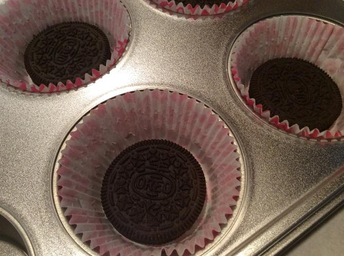 - Preheat the oven to 135°C / 275°F. Line a standard muffin pan with cupcake liners and place one whole Oreo cookie in the bottom of each liner.