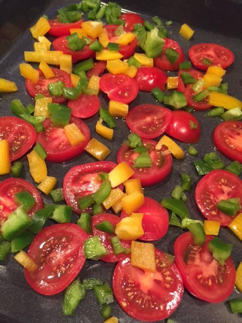 - Place the tomatoes and chopped peppers on a large rimmed sheet pan, spreading them out so they sit mostly in a single layer.
