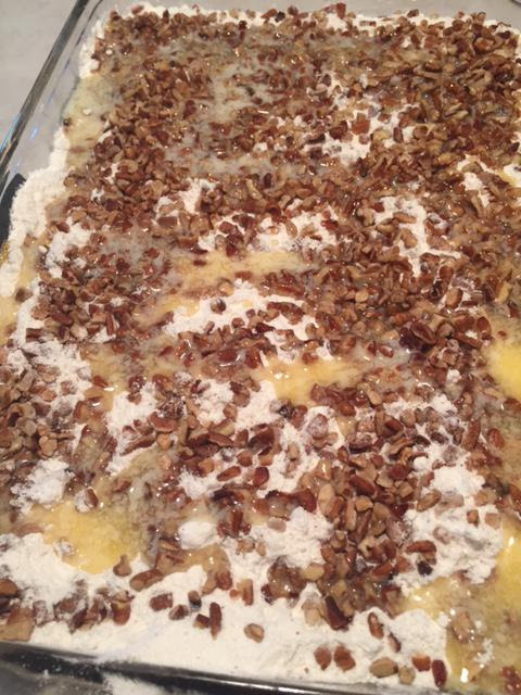 - Sprinkle the pecans evenly over the cake mix.