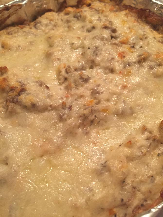- Fold in the sautéed onion and green pepper. Spread the mixture evenly into the prepared baking dish.