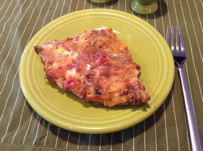kcalA hearty oven-baked frittata with sausage, peppers, onions, and melted Monterey Jack cheese.
