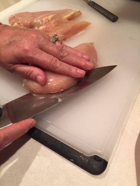 - Butterfly each chicken breast horizontally to create two thinner pieces. Place between sheets of plastic wrap or parchment.